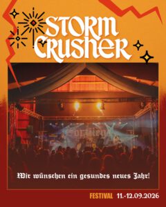 Vor dem Storm Crusher Festival 2026 [official] kommt was? Na klar! Der Band Crusher Contest 2026, bei dem sich herauskristallisieren wird, wer unser schmuckes Festival in diesem Jahr eröffnen darf. Hier die Facts zum Event: | Teilnahmeberechtigung | Teilnahmeberechtigt sind Bands, die alle folgenden Bedingungen … - |m| Storm Crusher Festival 2026 – Lineup completed |m|