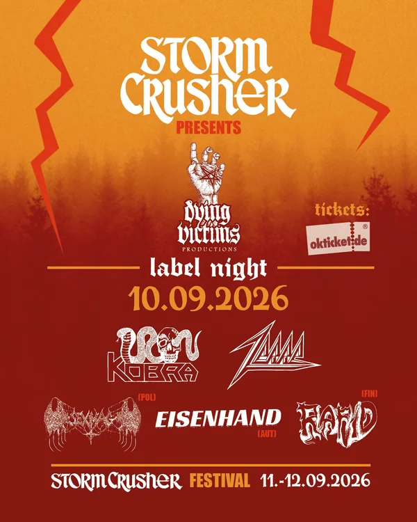 Und zwar in Form einer Label-Night. Mit Dying Victims Productions haben wir eines der angesagtesten und umtriebigsten Labels angefragt. Gründer und Inhaber Flo Grill war sofort Feuer und Flamme und stellte uns (und Euch) ein prächtiges Fünf-Gänge-Menü für den 10. September zusammen. RAPID aus Finnland, SEXMAG aus Polen, die Österreicher Eisenhand , ZERRE aus Würzburg und als dröhnendes Dessert Iron Kobra aus dem beschaulichen Gelsenkirchen werden in der O’Schnitt Halle aufspielen. Die Tore für dieses Spektakulum öffnen um 18 Uhr – „Musikbeginn“ ist dann ab 19 Uhr geplant. Als Unkostenbeitrag haben wir schmale 28 EURO fürs Hardticket (https://tinyurl.com/scf2026-labelnight-hardtickets) und 29,99 EURO (incl. Gebühren) für die Online-Ticketvariante (https://tinyurl.com/scf2026-labelnight) angesetzt. Das ganze läuft dabei als eigene Veranstaltung und ist nicht im Festival-Ticketpreis inkludiert.